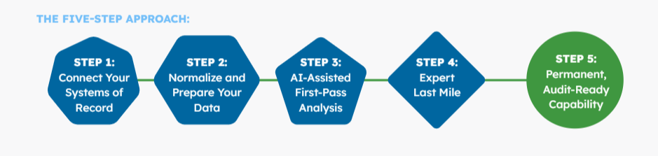 With your data consolidated and normalized, even simple analysis with widely available AI tools on your spreadsheets can run a first-pass analysis on the clean dataset: identifying potential pay gaps by worker category, flagging anomalies, and highlighting areas that may exceed the 5% threshold. This focuses your consultants’ time on judgment calls, not data assembly.